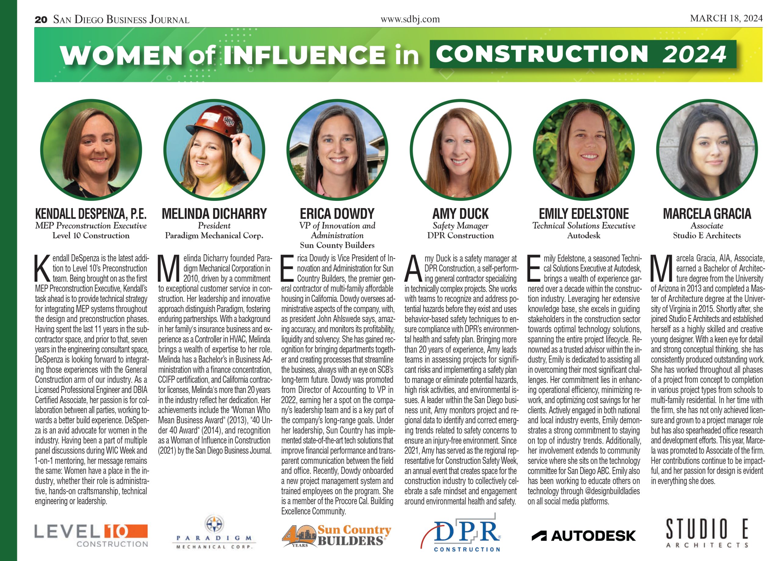 News Sun Country Builders’ Erica Dowdy Recognized In San Diego Business Journal’s 2024 Women Of Influence In Construction March 28, 2024 Congratulations to Erica Dowdy for this well-deserved recognition.